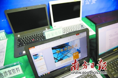 警方展示部分涉案资料和电脑。南方日报记者 张梓望 摄