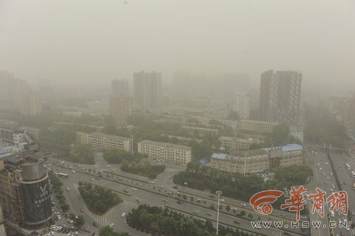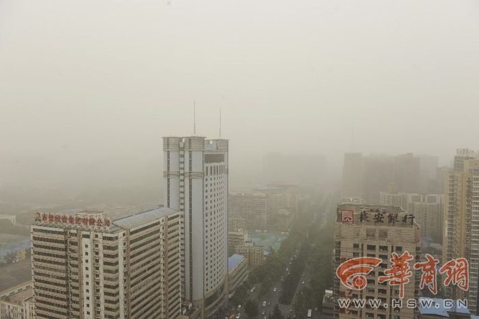 5月5日上午,西安市上空黄沙漫天,能见度差,外出的市民也提前戴着口罩出行。在会展国际酒店顶层,工作人员王先生称,他早上就发现天气不好,过了中午12时后,能见度更差,空气中弥漫着沙土气味。5月4日18时,中央气象台继续发布沙尘暴蓝色预警,称未来三天北方地区仍有大风沙尘天气,并伴有降温。