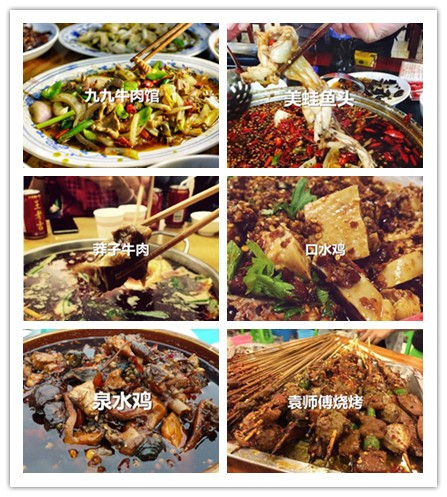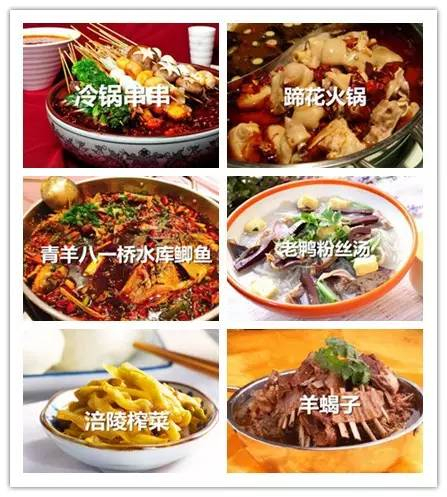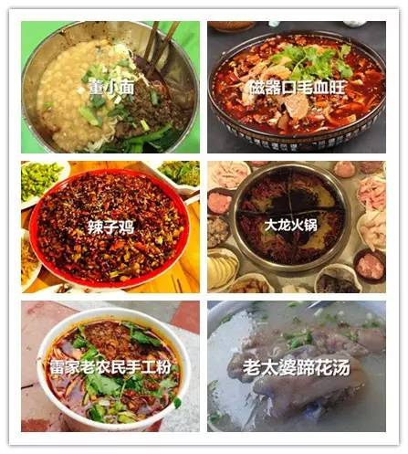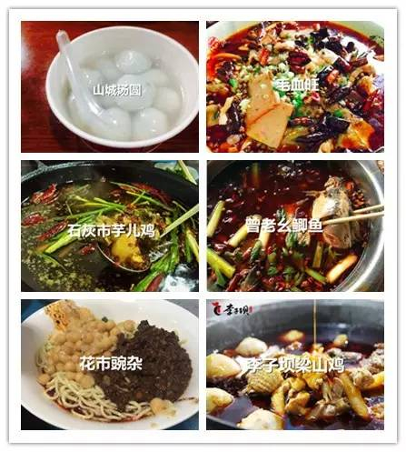 【宴客菜】:歌乐山辣子鸡、磁器口毛血旺、雷家老农民手工粉、老太婆蹄花汤、大龙火锅等