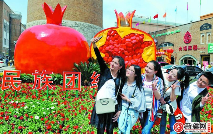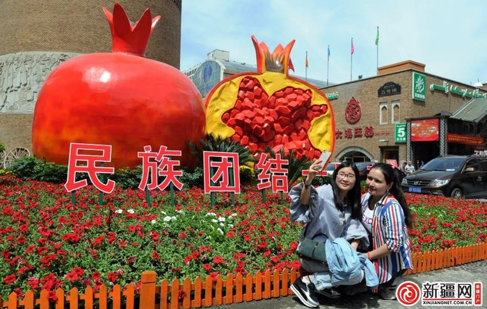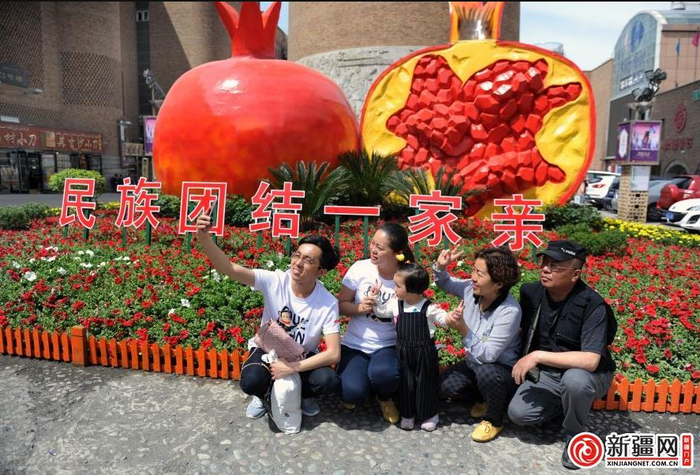 5月7日,在新疆国际大巴扎大型立体花堆“民族团结一家亲”前拍照留念。