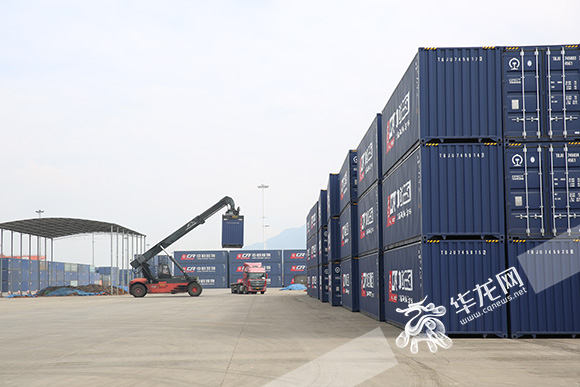 重庆团结村铁路口岸,印有深蓝色外表和白色“中欧班列”的集装箱整齐堆放在码头,等待工人的装卸。 记者 刘嵩 摄