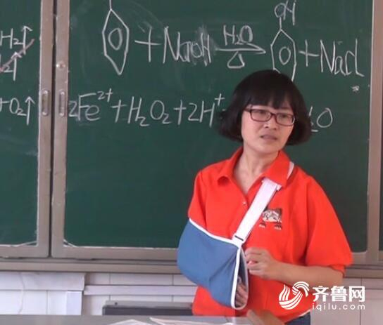 就这样洪秀英老师一边打着石膏,一边用左手板书,坚持着给学生上好每一节化学课。她要陪伴学生一直坚持到高考。