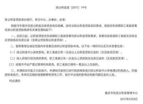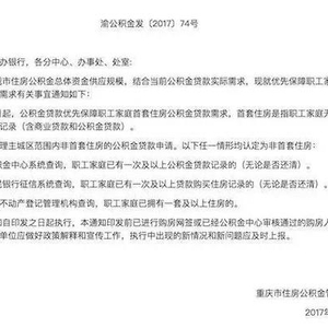 今(9)日,重庆市住房公积金管理中心网站发布《关于优先保障职工家庭首套住房公积金贷款需求的通知》。根据2017年度公积金资金供应总体规模,结合当前公积金贷款购房的实际需求,《通知》明确:即日起优先保障职工家庭首套住房公积金贷款需求,暂停受理主城区范围内非首套住房公积金贷款申请。