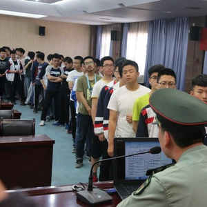 在宣讲会现场,同学们排成长队进行兵役登记和咨询,参加活动的学生为该校全体高三男生。