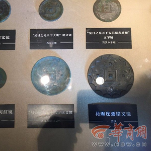 展览中一件“秦式云纹镜”有普通碟子大小,镜背的纹饰呈环状云纹图案,云纹清晰致密,灯光下闪耀着铜器的光泽。还有一件西汉时期的“花瓣连弧铭文镜”,镜背除精细的对称花瓣纹样,还有围绕弓形钮一圈的铭文,整个镜面看上去精美对称,有很强的艺术性。