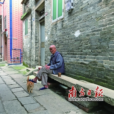在巷子里长凳上闲坐的老人。