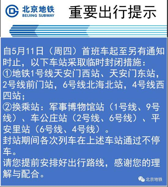@北京地铁:自5月11日(周四)首班车起至另有通知时止,以下车站采取临时封闭措施:①1号线天安门西站、天安门东站,2号线前门站,6号线北海北站,4号线西四站;②换乘站:军事博物馆站(1号线、9号线)、车公庄站(2号线、6号线)、平安里站(6号线、4号线),期间各次列车在上述车站通过不停车。请您提前安排好出行路线,感谢您的理解与配合。