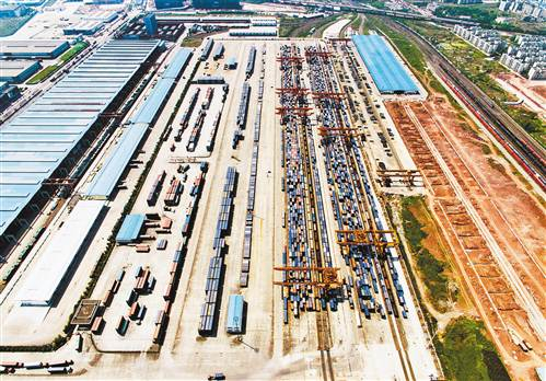 中欧班列(重庆)起点、重庆铁路口岸中铁联集重庆中心站(2017年4月14日摄)。2011年,首条中欧班列——渝新欧在重庆诞生,到2017年2月,渝新欧开行达到1000列。