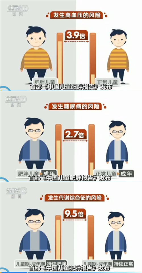 《报告》指出,儿童肥胖的发生和流行受遗传、环境和社会文化等多种因素的共同影响,出生前的母亲体型及营养代谢状况和儿童期环境因素,也将会影响儿童期甚至成年期肥胖相关慢性疾病的发生风险。而膳食结构的改变,身体活动的减少以及不健康饮食行为都会增加肥胖的风险。肥胖儿童发生高血压的风险是正常体重儿童的3.9倍。肥胖儿童成年后发生糖尿病的风险是正常体重儿童的2.7倍。儿童期至成年期持续肥胖的人群发生代谢综合征的风险是体重持续正常人群的9.5倍。除此以外,肥胖还会影响儿童青春期发育,危害呼吸系统及骨骼,对心理、行为、认知及智力产生不良影响。