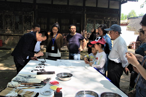 在忠义祠内的大黄桷树下,来自合川本地的书画家周健、丁志现场写字绘画,一幅幅翰墨飘香的书画作品赢得游客阵阵喝彩。在忠义祠前的茶园广场上,树荫下坐满了歇气喝茶的游客,来自合川名扬茶道馆的女茶艺师在古典音乐的悠扬伴奏下,为游客表演传统茶艺功夫。