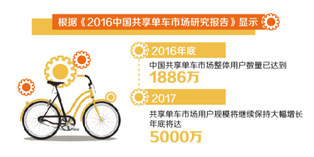 根据《2016中国共享单车市场研究报告》,2016年底,中国共享单车市场整体用户数量已达到1886万,2017年,共享单车市场用户规模将继续保持大幅增长,年底将达5000万。