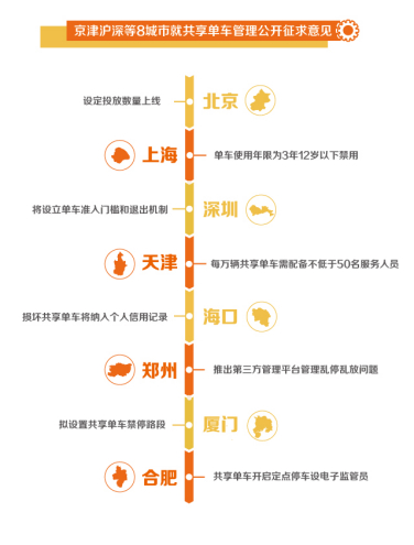 各地政府正在制定监管办法和措施。合肥市城管部门将与摩拜合作,通过科技手段,在停车点设置“电子监管员”即太阳能的电子停车牌。在电子停车牌周围划定一个虚拟的停车区域,使用者只有将共享单车停放到划定区域后才能进行结费,否则将被扣除信用分。