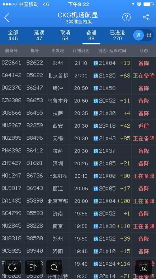 国航重庆分公司有工作人员表示,受此影响,截止晚上9点15分左右,空中航班7架,其中ca1761备降到了长沙,ca4320备降到了贵阳,ca1435备降南充,ca4350备降贵阳,ca4142备降西安,国航重庆出港航班剩余11班。