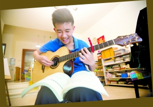 森友在家中练吉他,自弹自唱,十分享受。