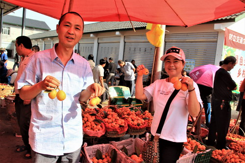 种植户鞠小林夫妇在枇杷交易市场销售枇杷。特约通讯员 周云 摄