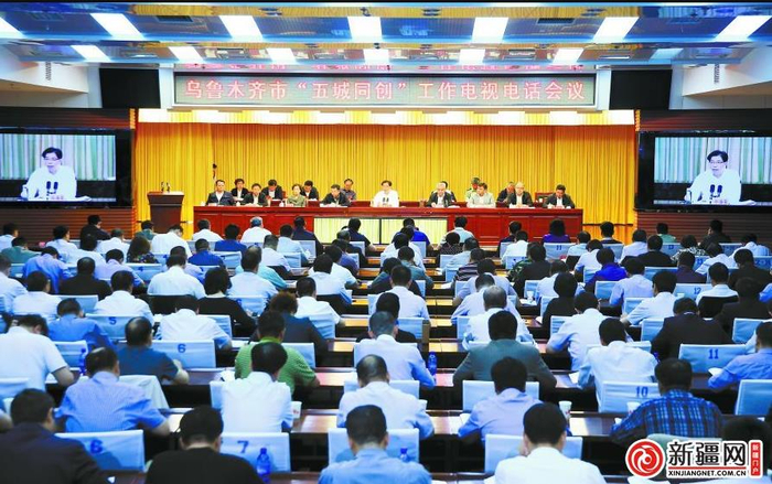 近日,我市召开“五城同创”工作电视电话会议,就深入推进全国文明城市、国家生态园林城市、全国民族团结进步示范市、国家创新型城市、国家食品安全示范城市创建工作进行安排部署。自治区党委常委、乌昌党委书记、市委书记徐海荣出席会议并讲话。图为:会议现场。(记者 陈星宇摄)
