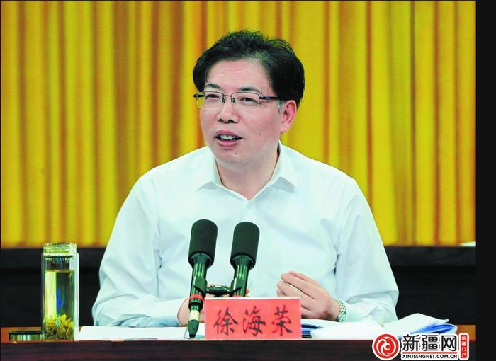 近日,我市召开“五城同创”工作电视电话会议,就深入推进全国文明城市、国家生态园林城市、全国民族团结进步示范市、国家创新型城市、国家食品安全示范城市创建工作进行安排部署。自治区党委常委、乌昌党委书记、市委书记徐海荣出席会议并讲话。图为:自治区党委常委、乌昌党委书记、市委书记徐海荣讲话。(记者 陈星宇摄)