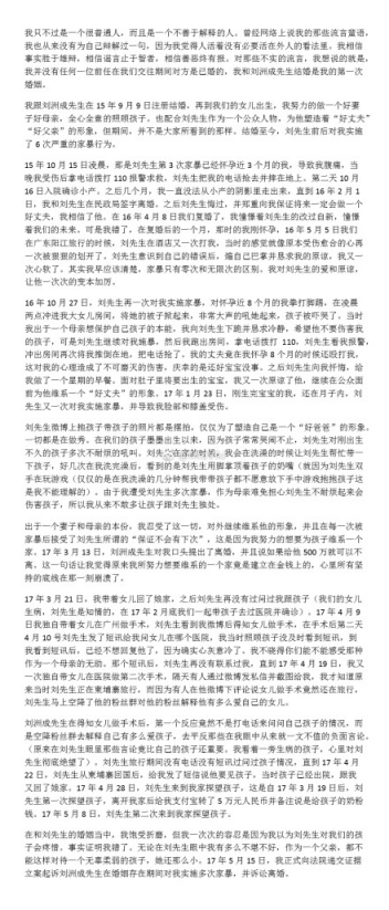 林苗在声明中说到,15年10月,刘洲成对怀孕3个月的她实施家暴,导致其腹痛,然后小产。两人曾在16年2月离婚,之后刘洲成向妻子道歉并保证悔过,16年4月两人复婚。16年10月,刘洲成再次对已经怀孕8个月的妻子实施家暴。林苗还说他俩微博上的恩爱照都是摆拍,只是为了维护刘洲成的形象。今年3月,刘洲成向林苗提出离婚,还说如果给他500万在中山买套房就不离。