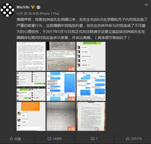 林苗在微博中称:“我跟刘洲成先生结婚以来,刘先生先后6次在孕期和月子内对我实施了严重的家暴行为,这段婚姻中我饱受折磨,刘先生的所作所为对我造成了不可磨灭的心理创伤,于2017年5月15日我正式向法院递交证据立案起诉刘洲成先生在婚姻存在期间对我实施多次家暴,并诉讼离婚。”