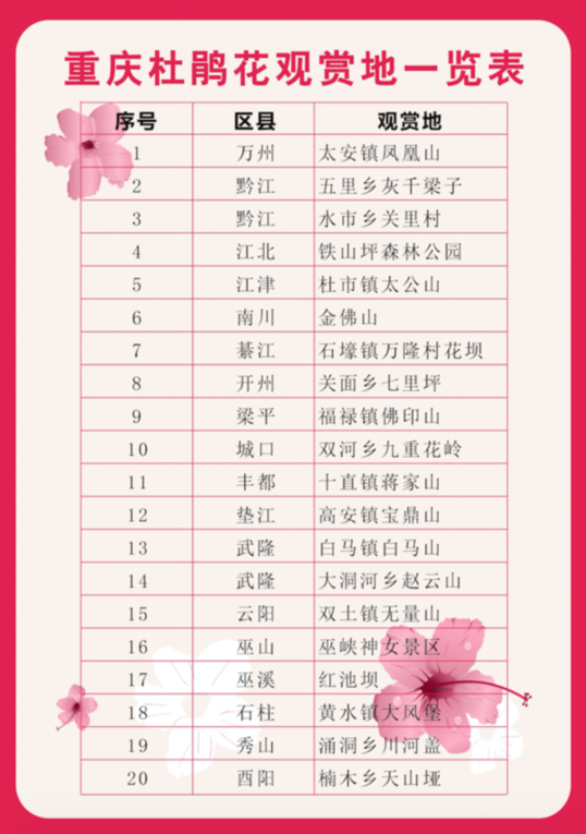 华龙网5月17日18时30分讯(首席记者周梦莹)无论是“若要盼得红军来,满山开遍映山红”的动人歌声,还是“蜀国曾闻子规鸟,宣城还见杜鹃花”的思乡情切,杜鹃花在中国传统文化中亦有充沛的感情寄托。今(17)日,重庆市规划局、重庆市地理信息中心推出《重庆杜鹃花地图》,盘点重庆20处最美的杜鹃花观赏地,在阳光晴好、微风涌动的时节,和心爱的人一起欣赏杜鹃染遍群山、花海如潮荡漾的美景吧。