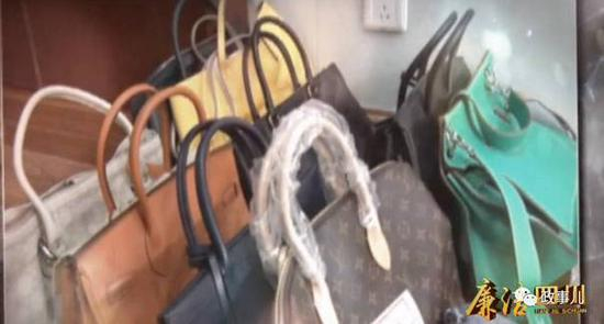 片中,还特意用一个画面来展示邓全忠受贿的女士包。画面中共有9个女包,色彩样式各异,其中一个印着某奢侈品标志的包,还裹着包装袋。在专题片中,未显示邓全忠收受男士包。