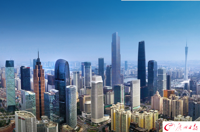 蓝天下,高楼林立的广州珠江新城CBD建筑群。