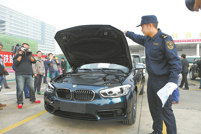 成都海关、四川出入境检验检疫局对蓉欧快铁进口整车进行联合查验。
