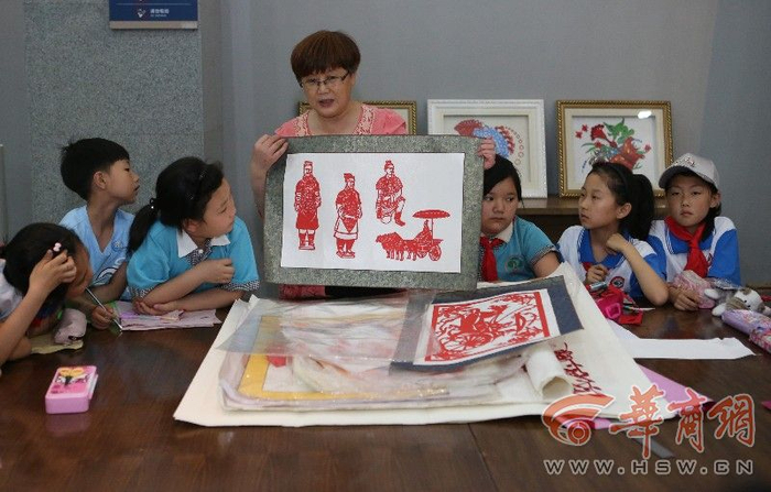 进入博物馆的活动专区,“雷氏秀样剪纸”传承人雷俊老师带来了20余幅精美的绣样剪纸作品,其中《将军俑》、《文官俑》、《跪射俑》等作品于2015年5月15日习近平主席陪同印度总理参观西安城墙期间受到特别关注。一幅幅作品满含着文化传承的深情,孩子们啧啧感叹的同时,也被非物质文化传承者的精湛工艺和坚韧的传承意志打动。