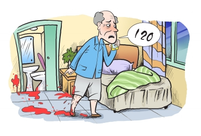 住院后,徐大爷忍着腿部疼痛,扶着墙下床活动了一会,便发现纱布上渗满了血。随后医生给他换药,揭开内层纱布时,溃疡创面再次喷射状出血,予以加压包扎,出血才停止。汪翔解释,徐大爷患病多年,血管壁早已变脆,稍有外力撞击或损伤导致破裂便引起大出血。如果出血时疼痛不明显,常无法察觉,还会出现失血性休克。