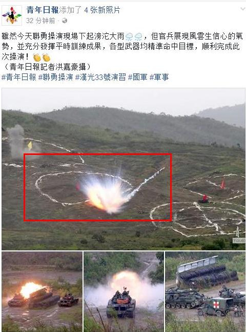 《青年日报》在报道时称,“虽然今天联勇操演现场下起滂沱大雨,但官兵展现风云生信心的气势,并充分发挥平时训练成果,各型武器均精淮命中目标,顺利完成此次操演”!