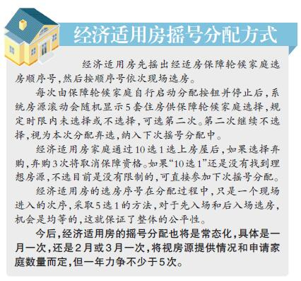 经济适用房采取“电脑筛选自主选房模式”进行,每户家庭有两次“5 选1”的机会,相当于可以“10选1”。公租房采取人房对应进行摇号分配,最终达到每月一次(详情见下表)。