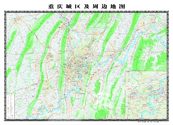 此外,新版《重庆城区及周边地图》对重庆主城区及周边最具特色的平行岭谷(包括主城四山)和长江、嘉陵江等都进行了突出表现,对各种规划及在建的铁路、高速公路等交通设施进行了呈现。并针对企事业单位和政府机关等重要地理信息密集的主城核心区域,单独划出进行放大和内容完善,在大图右下开窗以附图的形式进行表示,使图的实用性进一步完善。