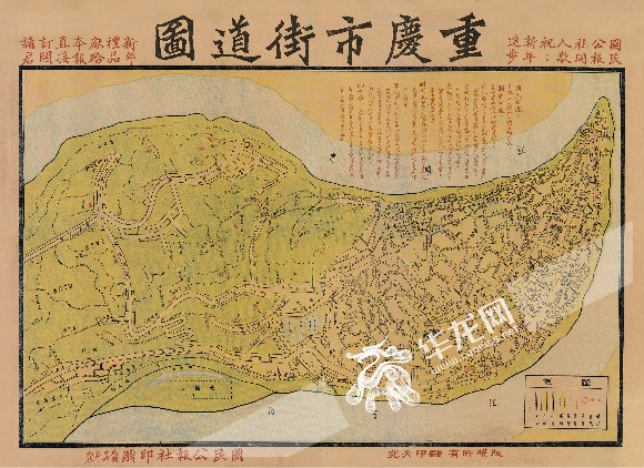 1937年国民公报《重庆市街道图》,抗战前夕,重庆城市已经拓展到两路口、上清寺一带。重庆市地理信息中心供图 华龙网 发第二次拓城,是从1937年底国民政府迁都重庆之后到抗战胜利,东部大量人口和学校、企业、政府机关等为躲避战乱内迁到重庆,重庆城市急剧拓展,除了往西拓展形成了著名的沙磁文化区并部分延伸到歌乐山、北碚外,靠近渝中半岛的长江、嘉陵江两江四岸地区也得到更多的开发,不论是从行政区划还是城市城区的角度,重庆市的范围都得到极大的扩张,奠定了解放之后到改革开放之前几十年城市发展的基本格局。
