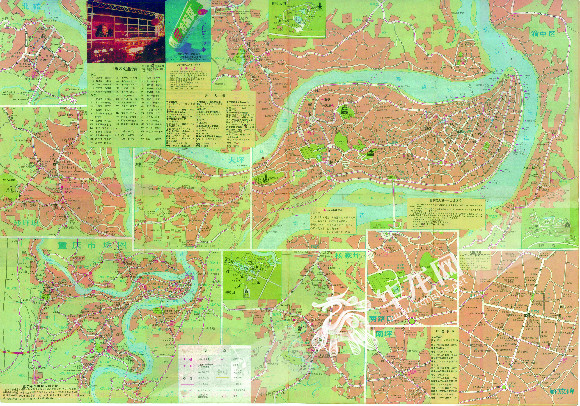 1995年《重庆市消费旅游指南图》,多中心的重庆城市机构已经非常明显。重庆市地理信息中心供图 华龙网 发第四次拓城,则是直辖之后,重庆城市中心区域原有组团之间开始无缝连接起来,并逐步向西突破中梁山、向东突破铜锣山和南山发展,大学城和茶园等城市新区开始起步,现在则有高新区和经开区继续牵引。