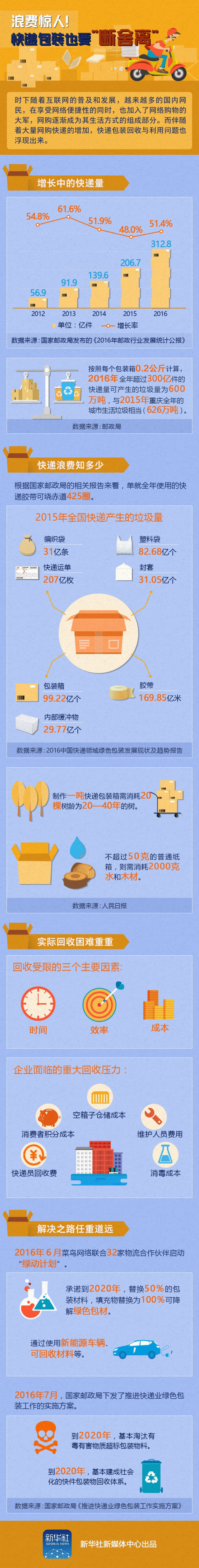 近年来随着网络购物快速发展,快递业呈现爆炸式增长。《2016年邮政行业发展统计公报》显示,快递服务企业2016年业务量达312亿件,连续6年年均增长超50%。