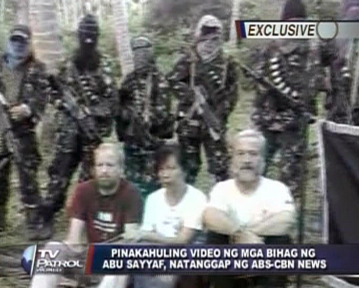 2009年3月28日,菲律宾阿布沙耶夫武装分子公布被劫持人质的录像截图。