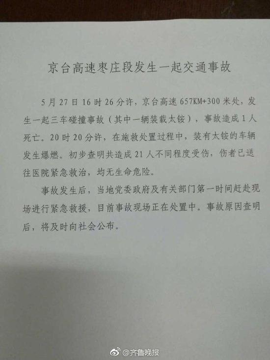 齐鲁晚报官方微博消息,G3京台高速枣庄段交通事故最新通报:5月27日下午,京台高速枣庄段三车连撞,致1人死亡。20时20分许,在施救处置过程中,一辆装有太铵的车辆发生爆燃,初步查明21人受伤,伤者均无生命危险。