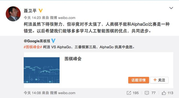对于AlphaGo和柯洁的比赛,聂卫平在微博上评论道:“柯洁虽然下得很努力,但毕竟对手太强了,人类棋手能和AlphaGo比赛是一种错觉。以后希望我们能够多多学习人工智能围棋的优点,共同进步。”