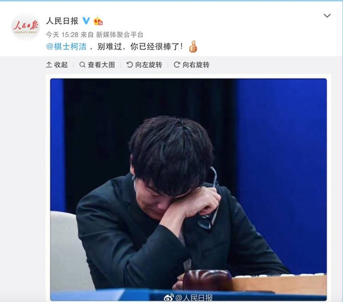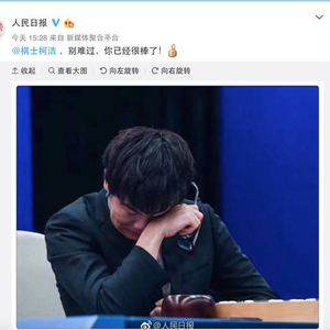 5月27日,围棋峰会进入最后一天。当天下午,柯洁九段中盘告负,总比分0:3败于AlphaGo。据新华社报道,棋至中局,柯洁起身离席,随后在现场的宣传板后激动洒泪,约20分钟之后才平复心情重返棋局,坚持下完了比赛。赛后柯洁一度哽咽称:它太完美我很痛苦,看不到任何胜利的希望。