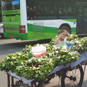这是怎样的一组照片呢?画面中,一个小女孩儿头上扎着发饰,坐在一个满是栀子花的流动车摊中,歪着头甜甜地吃着冰棍儿,她的母亲推着车,车上还挂着书包。微博的文字写道:“也许她没有芭比娃娃和华丽的衣衫,但是,幸福就是,高温炙烤下,我坐在花丛里,你给我万千鲜花的芳香,加上那一丝甜蜜的清凉。”