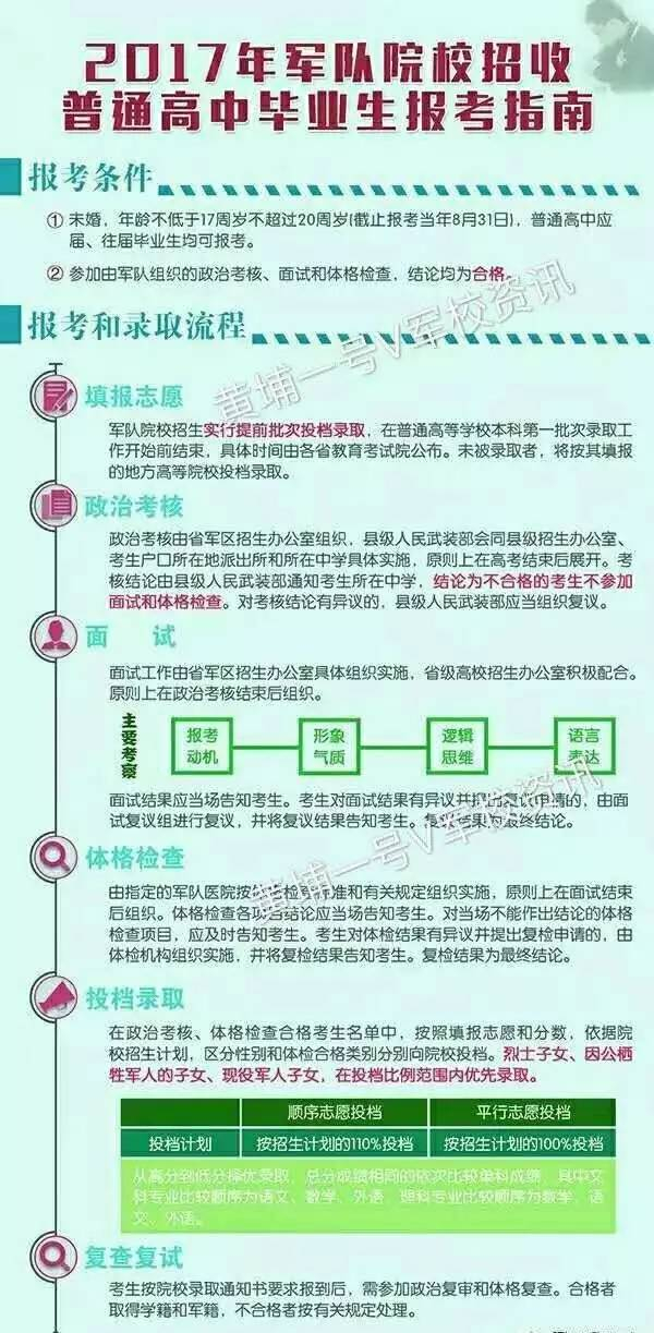 作为国防和军队改革的重要组成部分,围绕健全军队院校教育、部队训练实践和军事职业教育三位一体新型军事人才培养体系,军队院校进行了一次整体性革命性重塑重构,今年将按照新的院校体系部署展开招生工作。对考生来说,由于院校体系、招生专业的变化,往年各院校录取分数情况对志愿填报的参考借鉴价值缩水、可比性不强。请考生认真研究招生计划明确的院校、专业名称,特别是招考方向,结合自身优势特长和发展期望,合理填报志愿。招收普通高中毕业生的详细计划由各省教育部门在志愿填报前对外发布,士兵招生详细计划由军队单位逐级向考生明确。