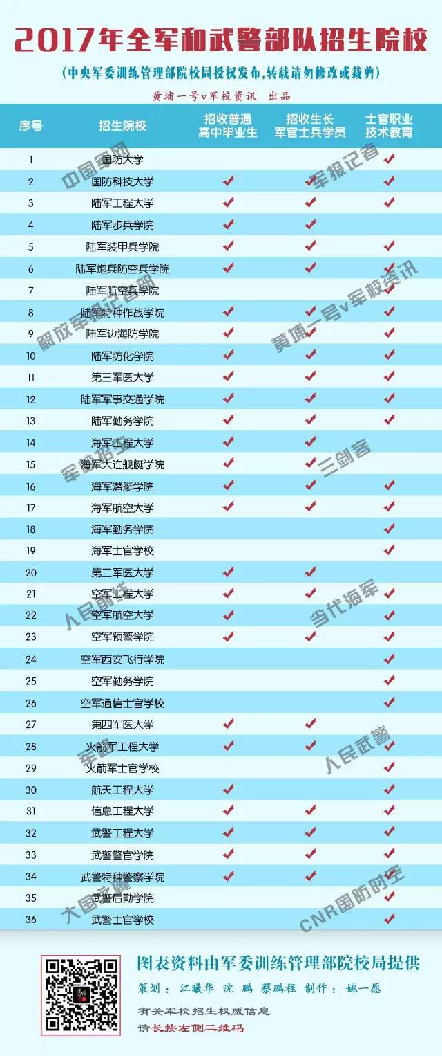 2017年全军和武警部队院校招生计划日前下达,36所院校招收普通高中毕业生1.2万名、生长军官士兵学员0.48万名、士官学员1.41万名。