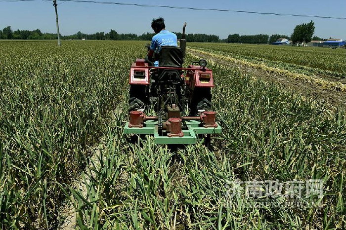 在白桥镇大蒜种植基地核心区和主产区,村村都是机械化大蒜收割的场景
