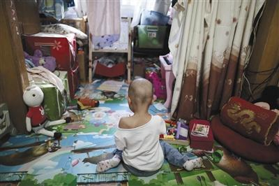 △美美在家中独自玩,大多数时间因为担心感染,肿瘤儿童只是在家和医院度过童年。摄影/新京报记者 侯少卿
