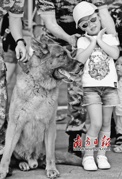 有着15年警犬训导经验的四级警士长胡雄兵带着家人参观军营。