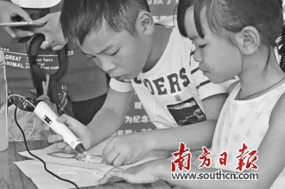 阳江小朋友用3D打印笔打出棒棒糖、眼镜等带回家。