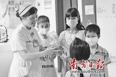 病愈孩子在和广州珠江医院的护士一起准备礼物,准备前去探望住院患儿。