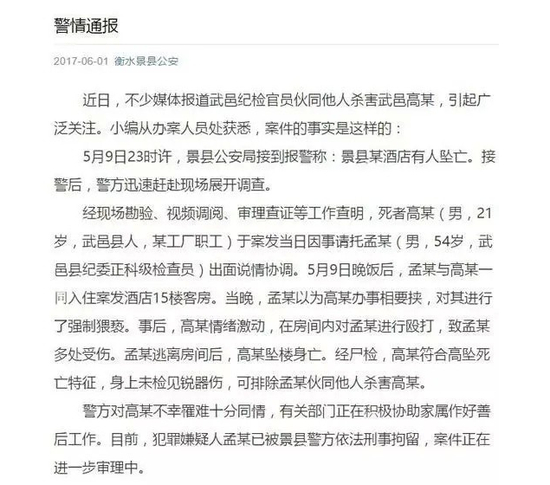 近日,不少媒体报道武邑纪检官员伙同他人杀害武邑高某,引起广泛关注。小编从办案人员处获悉,案件的事实是这样的:5月9日23时许,景县公安局接到报警称:景县某酒店有人坠亡。接警后,警方迅速赶赴现场展开调查。