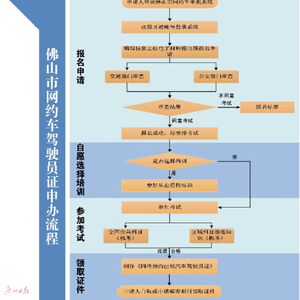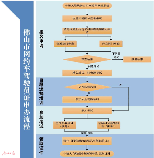 按照公布的办事指南,申请从事网约车服务的市民需要通过报名申请、自愿参加培训以及参加考试3个流程,考试合格后才能取得网约车驾驶员证。申请人可登录佛山市网约车审批系统(http://218.13.12.75:10012),录入个人相关资料,相关部门联合审核通过后将安排考试时间和地点。