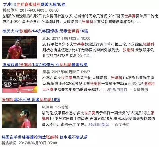 在本届世乒赛男单第三轮比赛中,张继科不敌韩国选手止步16强,爆出了最大冷门。媒体也在标题中使用了“大冷门”、“爆冷”等词语——